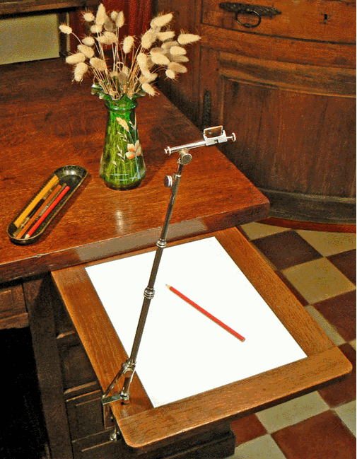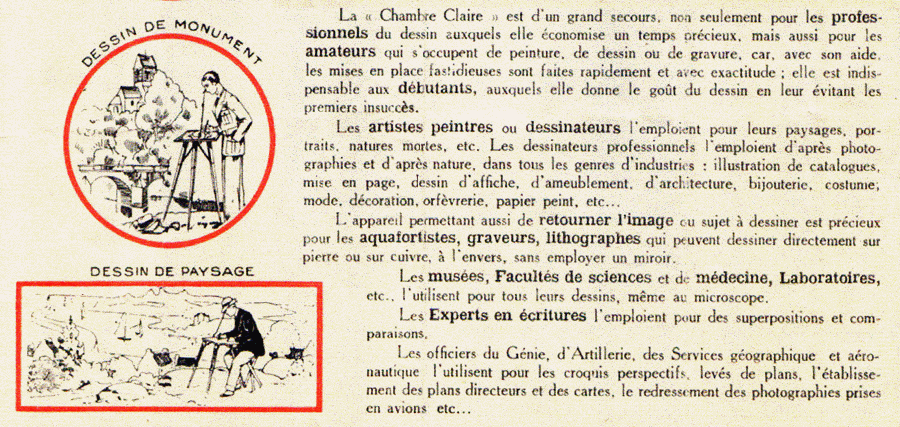 Cliquez sur l'une des vignettes précédentes pour ouvrir, à gauche, la page de la chambre claire type Wollaston par l'Ingénieur Chevallier ou, à droite, la page de la chambre claire de Nachet pour les travaux de microscopie. |