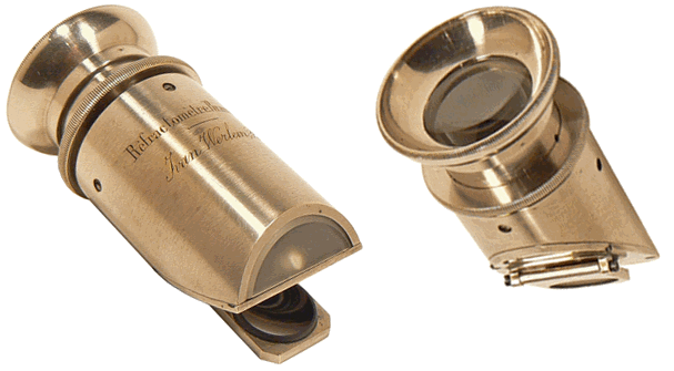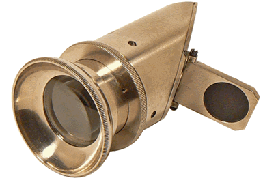 Les deux photographies ci-dessus sont celles d'un second instrument présenté en partie démonté. La première image permet de distinguer la lentille demi-boule dans sa totalité : la face plane extérieure et la face intérieure hémisphérique. La seconde image montre la pièce cylindro-conique interne qui se termine par le réticule en verre sur lequel l'opérateur met au point par tirage de l'oculaire dont on voit la colerette à droite. |