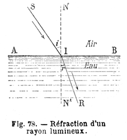 Sur la Fig. 78 empruntée aux "Leçons de Physiques" de L. Margat-L'Huillier (1897), SI est un rayon incident arrivant en I sur la surface de séparation AB de deux milieux transparents (Il s'agit, ici, de l'air et de l'eau). La direction IR suivant laquelle
