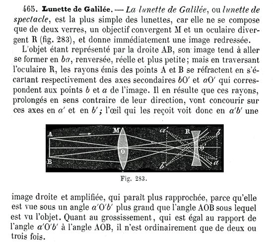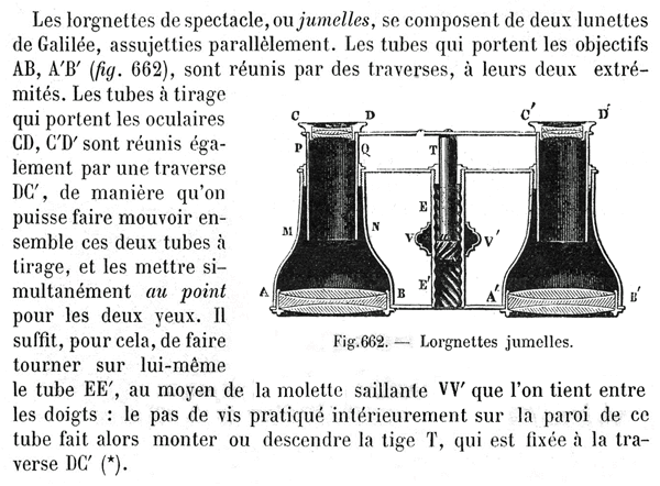 Dans chacune des lorgnettes de la fig. 662, l'objectif (convergent) et l'oculaire (divergent) sont formés chacun de trois lentilles superposées afin d'éviter les phénomènes d'irisation sur les bords des images. Les lentilles forment un système dit achromatique. |