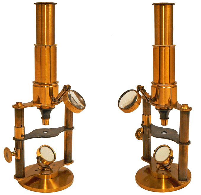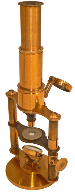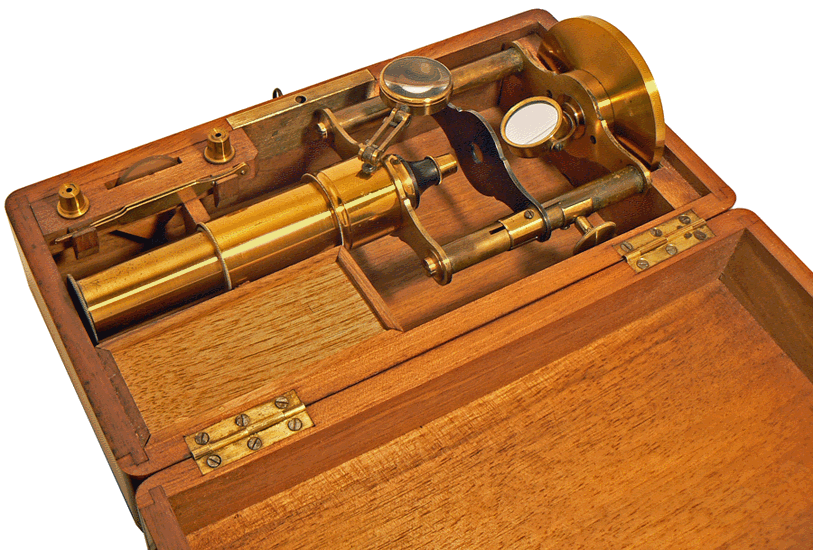 Microscope droit à deux colonnes - Coffret en acajou 26,5 x 14 x 9 cm - France - Vers 1860 |