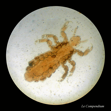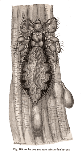 Dans le coffret, deux objectifs supplémentaires numérotés 2 et 3, la pince fine et le disque à concavité, accompagnent six préparations de 6 x 1,6 cm réalisées dans la deuxième moitié du XIXe siècle : tige de vigne, puce de chat, plume de colibri, bout de patte de hanneton, pou humain et trompe de mouche. Comme les autres préparations, celle du pou humain est réalisée entre deux lames de verre identiques. Des bandelettes de papier vert collées aux extrémités maintiennent les lames plaquées l'une contre l'autre. L'étanchéité n'est sans doute pas parfaite et l'état de conservation du spécimen est très moyen. |