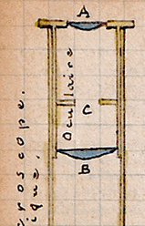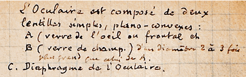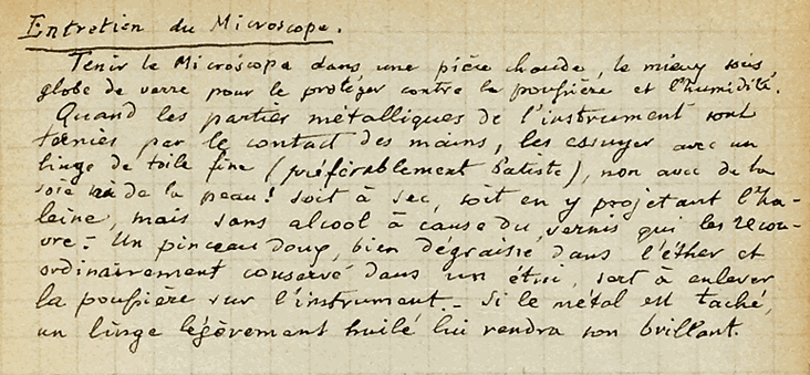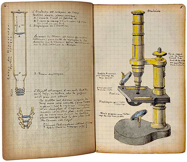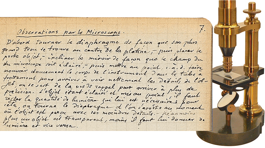 Le petit carnet a suivi un chemin différent de celui du microscope pour parvenir jusqu'à nous. Son auteur l'a commencé au début du XXe siècle (une observation commentée d'infusoire est datée du 9 octobre 1906). Il renferme une belle description de l'instrument ainsi que des conseils d'utilisation... |