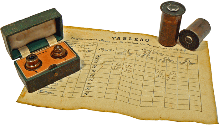 A côté de l'écrin dans lequel sont rangés les objectifs, on remarque la boîte de lamelles couvre-objet, les aiguilles droites emmanchées et la pince fine. L'ensemble appartient au coffret du microscope C. Vérick n° 1932. |