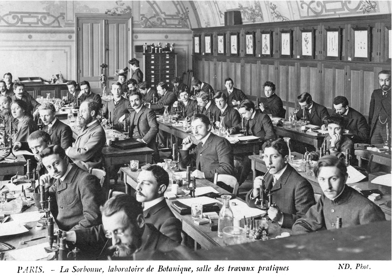 Au premier plan, sur cette photographie prise dans une salle de travaux pratiques de botanique de la Sorbonne au début du XXe siècle, les deux microscopes portent probablement la même signature que le nôtre... |