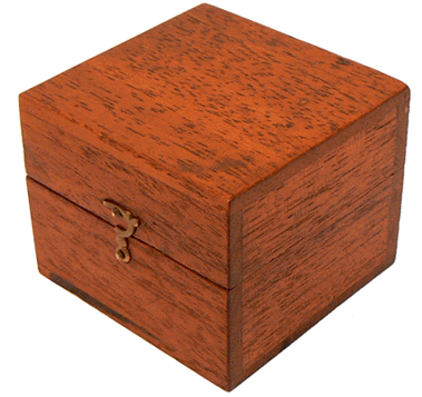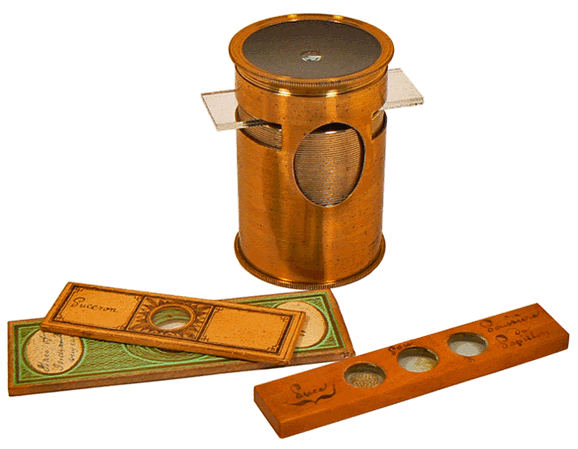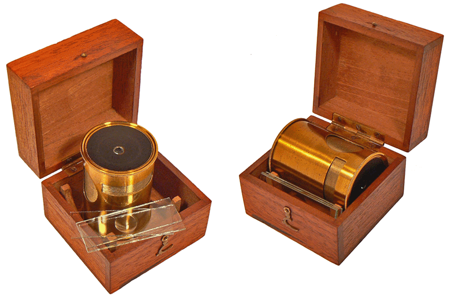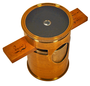 Dans un petit coffret en acajou, le microscope est accompagné de quatre lames en verre de 5 cm comportant, pour deux d'entre elles, une concavité. L'objet à examiner est placé dans l'espace réduit formé entre une lame à concavité et une lame plane. L'observation s'effectue à travers la lentille biconvexe de petit diamètre sertie dans un oeilleton à vis permettant le réglage de la netteté. La hauteur du microscope est égale à 5,2 cm et son diamètre est de 3,9 cm. |