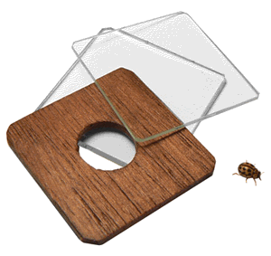L'instrument en laiton doré a une longueur de 6,5 centimètres. Il est muni de trois petites plaquettes dont deux sont en verre, la troisième, évidée en son centre, étant en acajou. On les superpose pour former une cellule d'observation qui peut recevoir des animaux vivants de taille modeste tels les fourmis, les très petites araignées ou autres zygentomes de la famille des "poissons d'argent" et même, comme on peut le voir plus loin, une coccinelle minuscule ... |