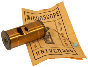 l'Enseignement, tels certains utilisés au lycée et réunis dans cette armoire vitrée. C'est aussi l'envie de faire connaître ou reconnaître les plus modestes d'entre eux comme, ci-dessous, le floroscope. Nous aimons imaginer que l'écolier des premières années 1900, ayant la chance de posséder ce petit microscope, le mettait quelquefois dans son cartable ou dans une poche de sa blouse pour pouvoir l'utiliser au hasard de ses trouvailles sur le chemin de la classe... Aujourd'hui, ce sont des