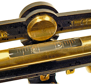 Le niveau à bulle permet de suivre le réglage de l'horizontalité et, sur l'image de droite, le cercle divisé à la base de l'instrument, indique l'angle entre deux directions d'un plan horizontal. |