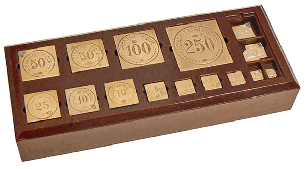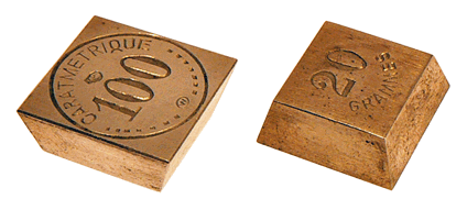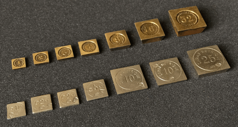 Série de "poids carats métriques" , en maillechort sur taquet en bakélite de 12,5 x 5 cm - Vers 1915 |