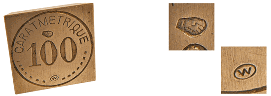 Ces poids carats métriques portent le poinçon de "vérification primitive" apposé par le service des poids et mesures. Ce poinçon garantit la validité de la valeur indiquée lors de sa mise en service. Il s'agit de la marque "à la bonne foi" symbolisée par une poignée de main. Est également présente la marque du balancier, un W dans un ovale qui, si l'on se réfère au bulletin numéro 2001/2 de la Société métrique de France, est celle de Paul WALTON inscrit en 1911 au Registre des fabricants de poids et mesures. |