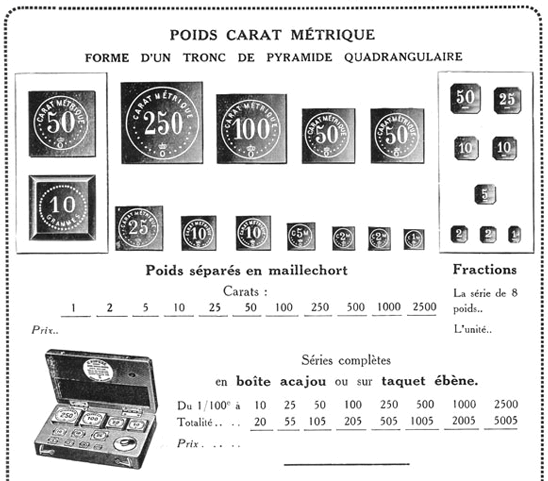 Dans son catalogue Balances et Accessoires de Précision pour le commerce des Diamants, Perles Fines, Pierres Précieuses, la Maison EXUPÈRE propose, vers 1910, une série identique à celle présentée sous le titre de cette page. |