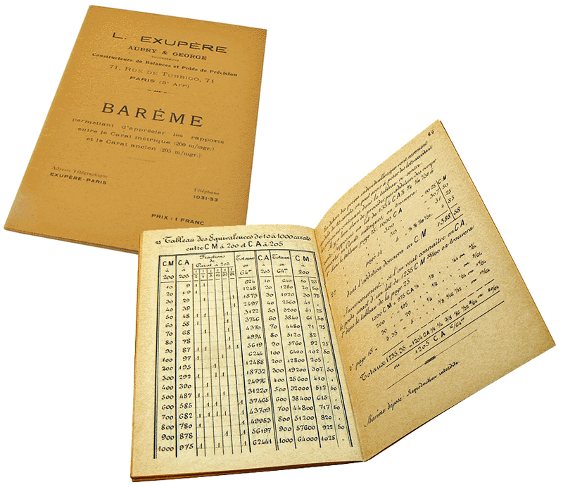 En France, le carat métrique devenant le seul autorisé par la loi du 22 juin 1909, les constructeurs ont proposé, pendant une période de transition, des convertisseurs sous forme de disques de calculs ou, comme chez EXUPÈRE, un barême pour aider les utilisateurs, marchands de pierres et de perles, à exprimer les résultats dans la seule unité légale. |