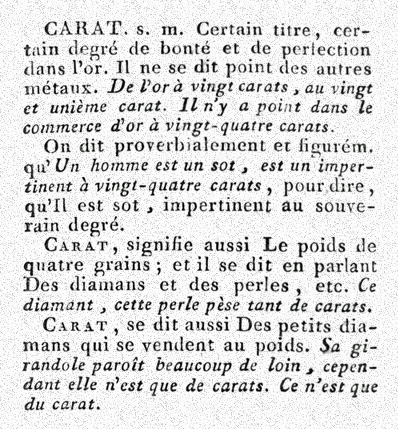 Le carat dont il est question sur cette page est une unité de masse. Que l'on parle du carat ancien ou du carat métrique, le sens est le même et seule la valeur exprimée en grammes change : 0,205 g ou 0,200 g. Il existe une autre signification du carat, joliment écrite dans le dictionnaire de l'académie française de 1798 : |