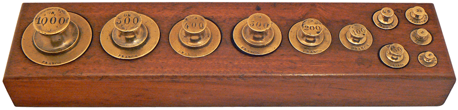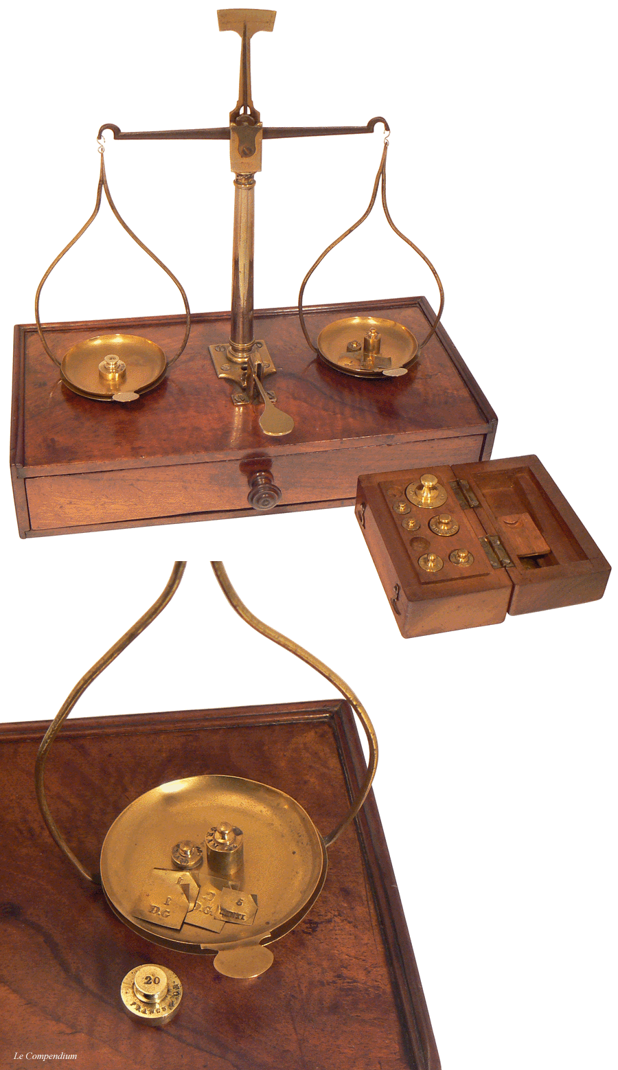 A gauche, la tare 1000 francs or pèse presque 322,60 g ce qui correspond à 50 Louis d'or ou Napoléon de 20 francs. A droite, la plus petite tare, qui correspondant à 5 francs or, pèse un peu plus de 1,60 g, masse qui caractérise la petite pièce de 5 francs or représentant Napoléon III. Il est donc facile, en utilisant certaines des tares de la série et en particulier les tares de valeurs 100, 50, 20, 10 et 5 francs or, de vérifier si l'une ou l'autre des pièces en or est "trébuchante" c'est-à-dire, en se référant au DICTIONNAIRE DE L'ACADÉMIE FRANÇAISE de 1798, si elle "est de poids". |