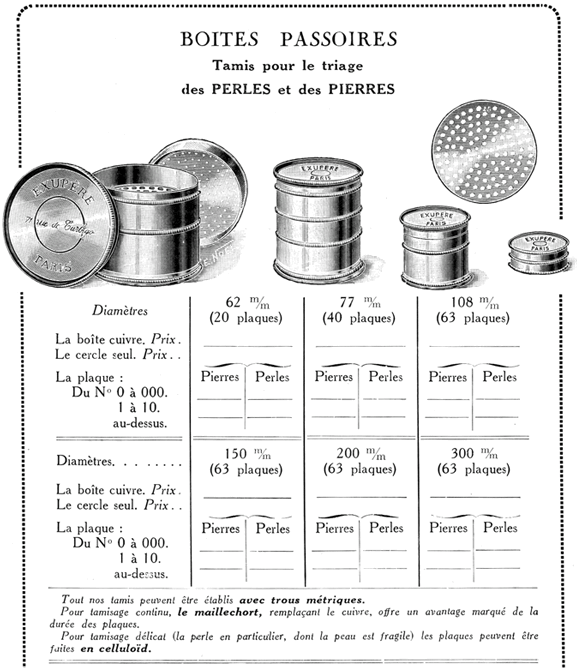 Les deux tamis formés sont destinés à être superposés lors de la reconstitution de la boîte. C'est le disque dont le numéro est le plus élevé qui est placé sur le dessus. On comprend que si l'on dépose un groupe de perles de plusieurs grosseurs dans le tamis supérieur, seules les perles dont le diamètre est au maximum celui des trous, tombent dans le tamis inférieur. A son tour, le deuxième tamis ne retient que les perles dont le diamètre est supérieur à celui de ses trous. Le choix des deux disques détermine la grosseur des perles qui sont récupérées dans le tamis supérieur, dans le tamis inférieur, et dans le fond de la boîte. Le choix de deux disques aux numéros consécutifs permet d'isoler, entre eux, les perles d'un seul calibre. |