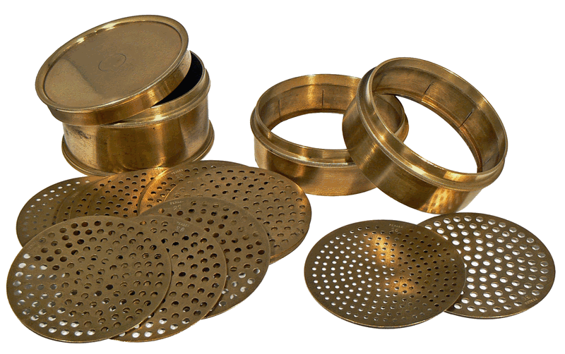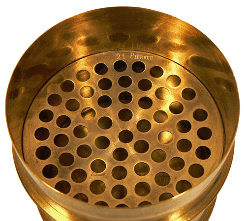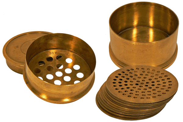 Ce premier modèle, destiné au tri des perles selon leur grosseur, possède un ensemble de disques de 77 mm de diamètre, numérotés de 15 à 29. Deux tamis peuvent être constitués simultanément en insérant un disque dans chacun des deux supports cylindriques. |