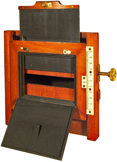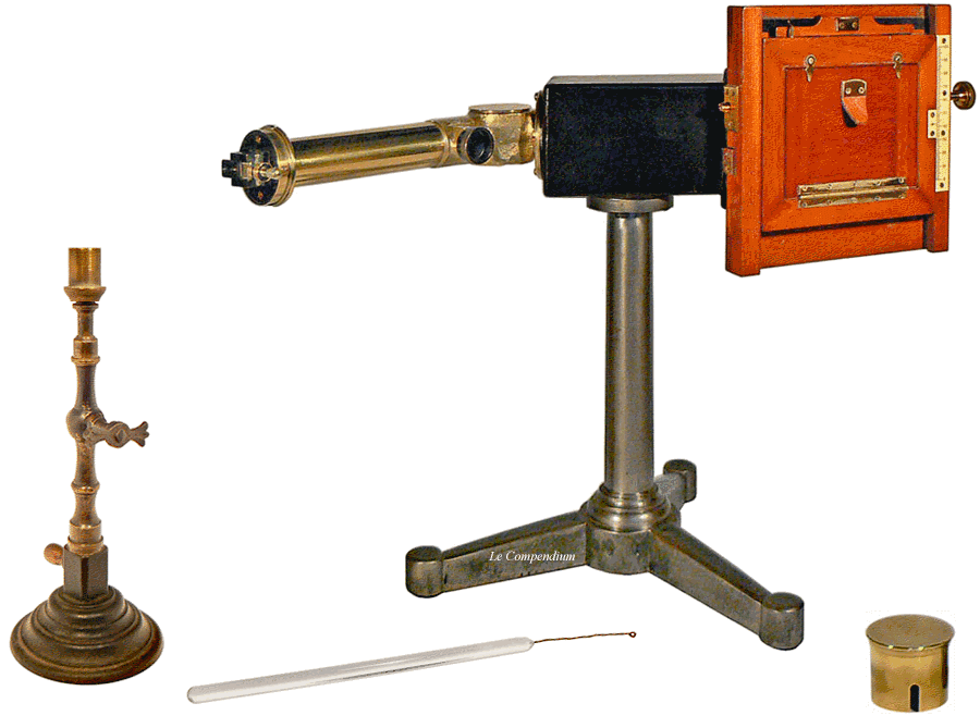Les photographies des spectres sont obtenues sur des plaques de 10,7 x 8,2 cm placées dans un châssis en acajou. Le déplacement vertical et repérable du châssis permet d'enregistrer plusieurs spectres sur la même plaque. Une échelle micrométrique superposée au spectre permet de déduire les longueurs d'onde à partir de la position des raies d'éléments connus. |
